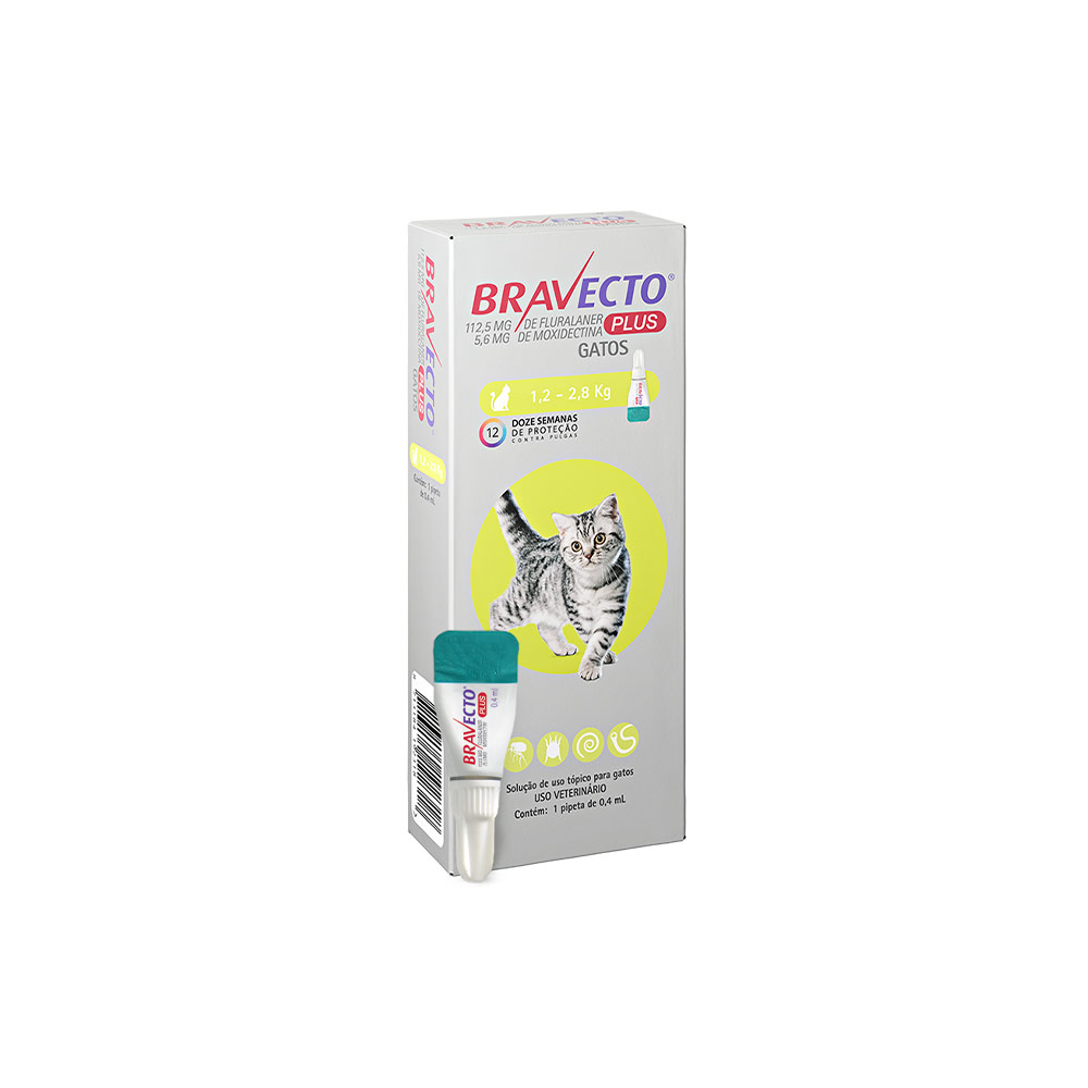 - Indicação Para gatos com ou em risco de infestações parasitárias mistas por pulgas e nematódeos gastrointestinais (vermes de Toxocara cati, Toxascaris sp, e Ancylostoma tubaeforme) e ácaros de orelha (Otodectes cynotis). BRAVECTO® PLUS GATOS é indicado quando o uso contra pulgas e um ou mais dos outros parasitas-alvo são indicados ao mesmo tempo. No tratamento de infestações por pulgas (Ctenocephalides felis) em gatos, proporciona atividade de eliminação persistente por 12 semanas, que devem começar a se alimentar no hospedeiro para serem expostas aos princípios ativos, portanto o risco de transmissão de doenças causadas por pulgas não pode ser excluído. Para o tratamento de infestações por Otodectes cynotis. O produto pode ser utilizado como parte de uma estratégia de tratamento para a dermatite alérgica à picada de pulgas (DAAP).