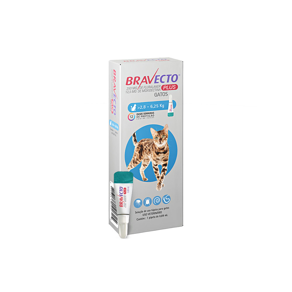 - Indicação Para gatos com ou em risco de infestações parasitárias mistas por pulgas e nematódeos gastrointestinais (vermes de Toxocara cati, Toxascaris sp, e Ancylostoma tubaeforme) e ácaros de orelha (Otodectes cynotis). BRAVECTO® PLUS GATOS é indicado quando o uso contra pulgas e um ou mais dos outros parasitas-alvo são indicados ao mesmo tempo. No tratamento de infestações por pulgas (Ctenocephalides felis) em gatos, proporciona atividade de eliminação persistente por 12 semanas, que devem começar a se alimentar no hospedeiro para serem expostas aos princípios ativos, portanto o risco de transmissão de doenças causadas por pulgas não pode ser excluído. Para o tratamento de infestações por Otodectes cynotis. O produto pode ser utilizado como parte de uma estratégia de tratamento para a dermatite alérgica à picada de pulgas (DAAP).