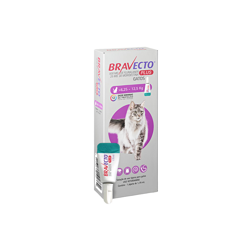 - Indicação Para gatos com ou em risco de infestações parasitárias mistas por pulgas e nematódeos gastrointestinais (vermes de Toxocara cati, Toxascaris sp, e Ancylostoma tubaeforme) e ácaros de orelha (Otodectes cynotis). BRAVECTO® PLUS GATOS é indicado quando o uso contra pulgas e um ou mais dos outros parasitas-alvo são indicados ao mesmo tempo. No tratamento de infestações por pulgas (Ctenocephalides felis) em gatos, proporciona atividade de eliminação persistente por 12 semanas, que devem começar a se alimentar no hospedeiro para serem expostas aos princípios ativos, portanto o risco de transmissão de doenças causadas por pulgas não pode ser excluído. Para o tratamento de infestações por Otodectes cynotis. O produto pode ser utilizado como parte de uma estratégia de tratamento para a dermatite alérgica à picada de pulgas (DAAP).