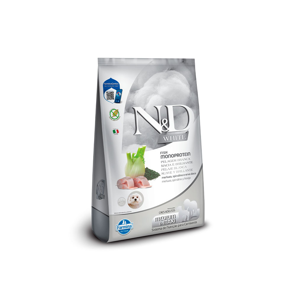 N&D White para Cães Adultos de Raças Médias e Grandes Sabor Merluza, Spirulina e Erva Doce 7 Kg