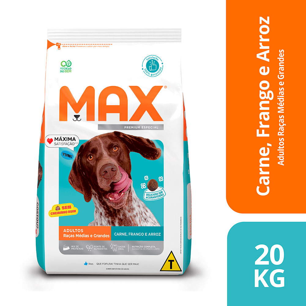- Com Max Cães Adultos Raças Médias e Grandes Carne, Frango e Arroz é fácil cuidar do seu filho de quatro patas, para ele viver saudável e feliz;
