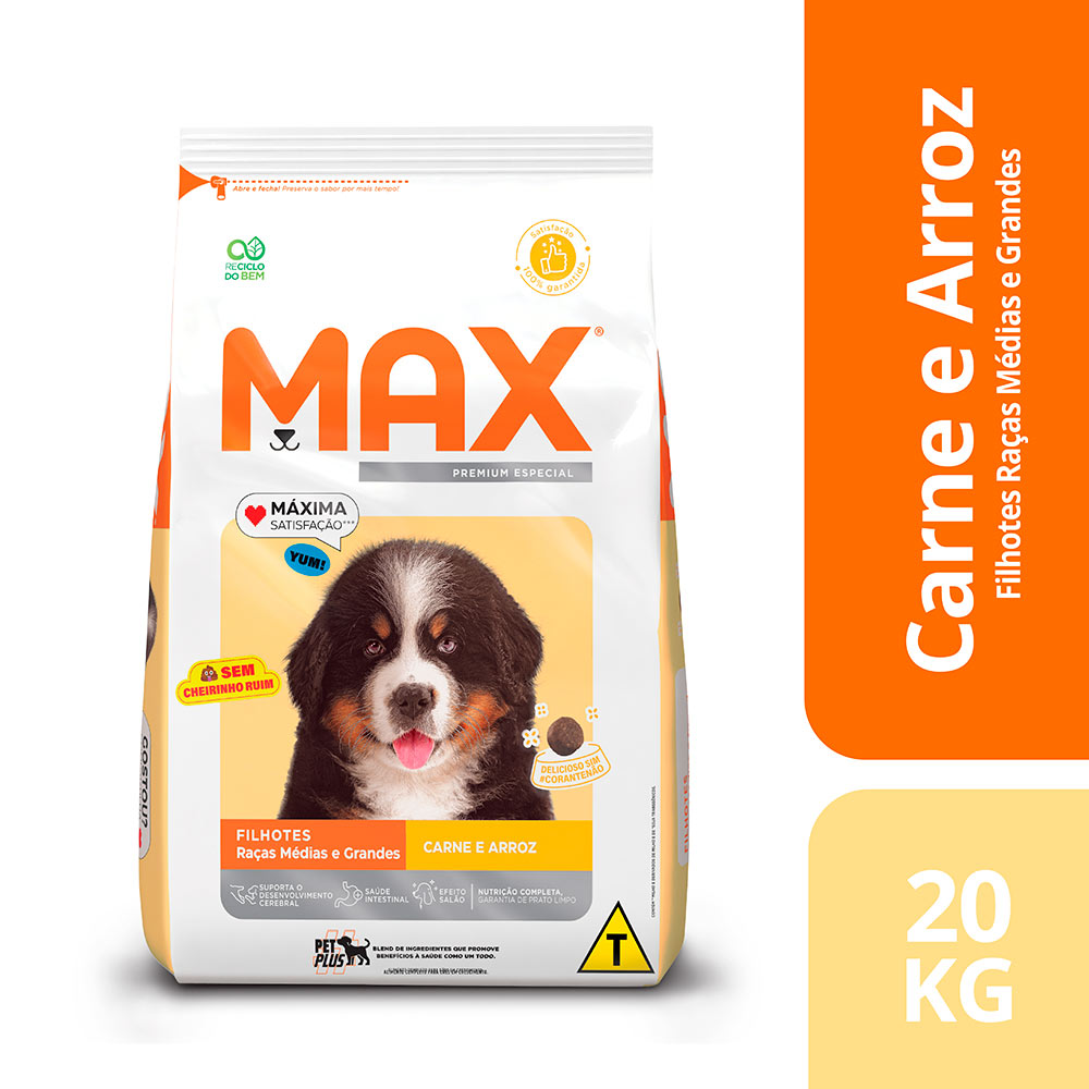 - Com Max Cães Filhotes Raças Médias e Grandes Carne e Arroz é fácil cuidar do seu filho de quatro patas, para ele crescer saudável e feliz;
