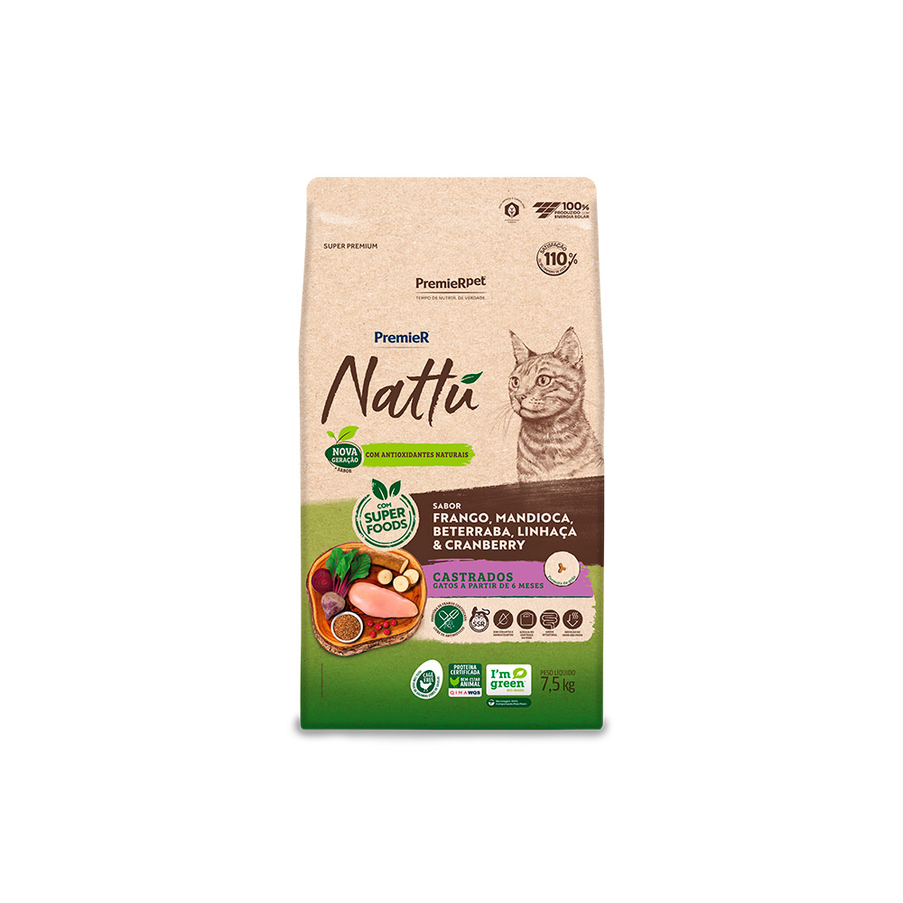 Ração Premier Nattu para Gatos Adultos Castrados Sabor Mandioca